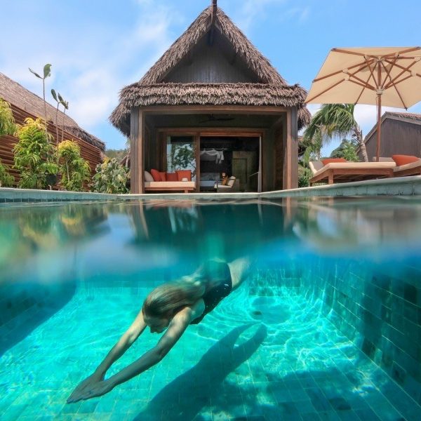 Eine private Poolvilla unter Palmen.